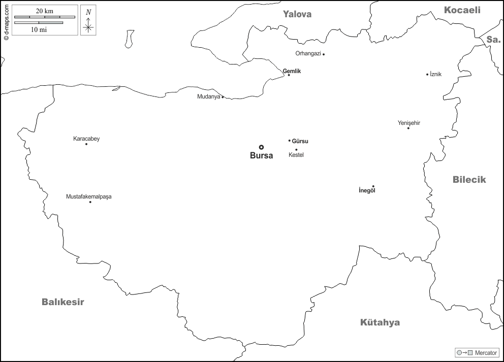 d-maps > 亚洲 > 土耳其 > 布尔萨省 > 边界, 主要城市, 名称, 白