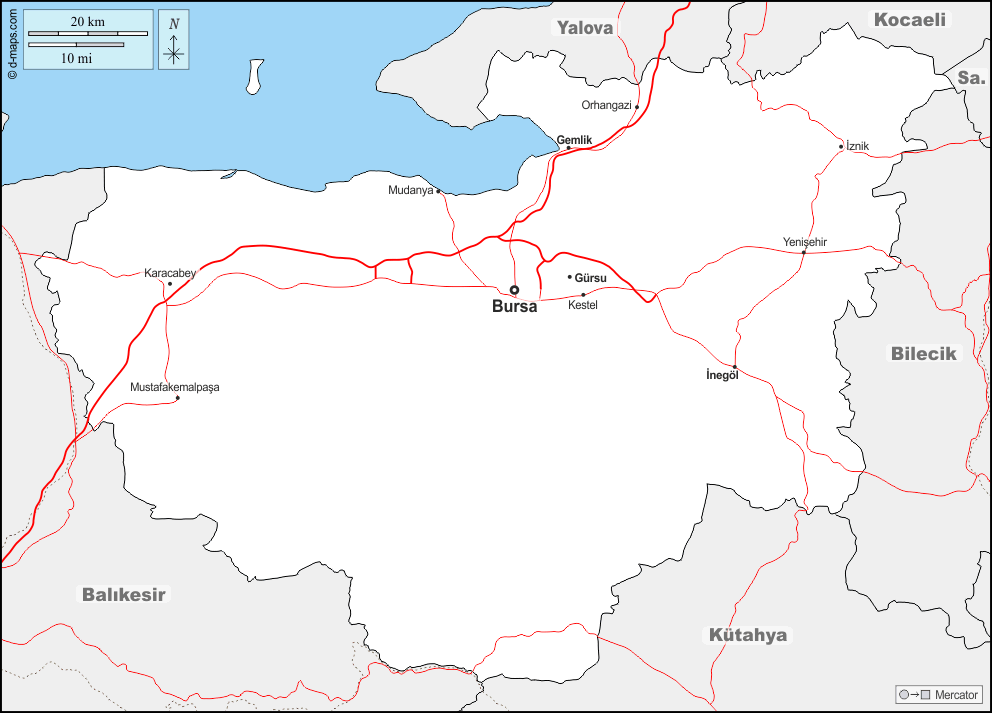 d-maps > 亚洲 > 土耳其 > 布尔萨省 > 边界, 主要城市, 道路, 名称