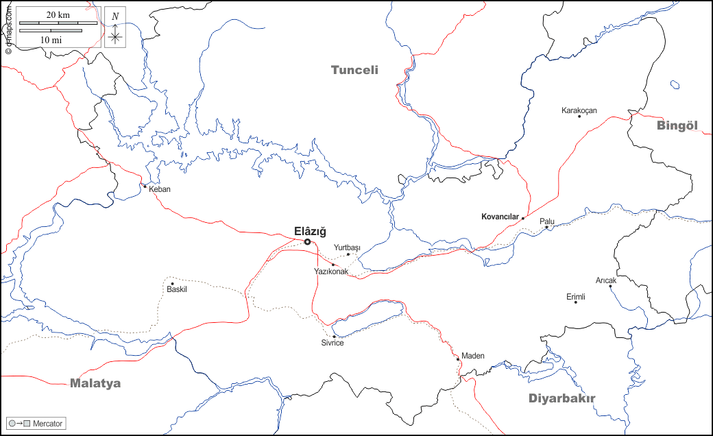 Aricak - Baskil - Elâzig - Erimli - Karakoçan - Keban - Kovancilar - Maden - Palu - Sivrice - Yazikonak - Yurtbasi
