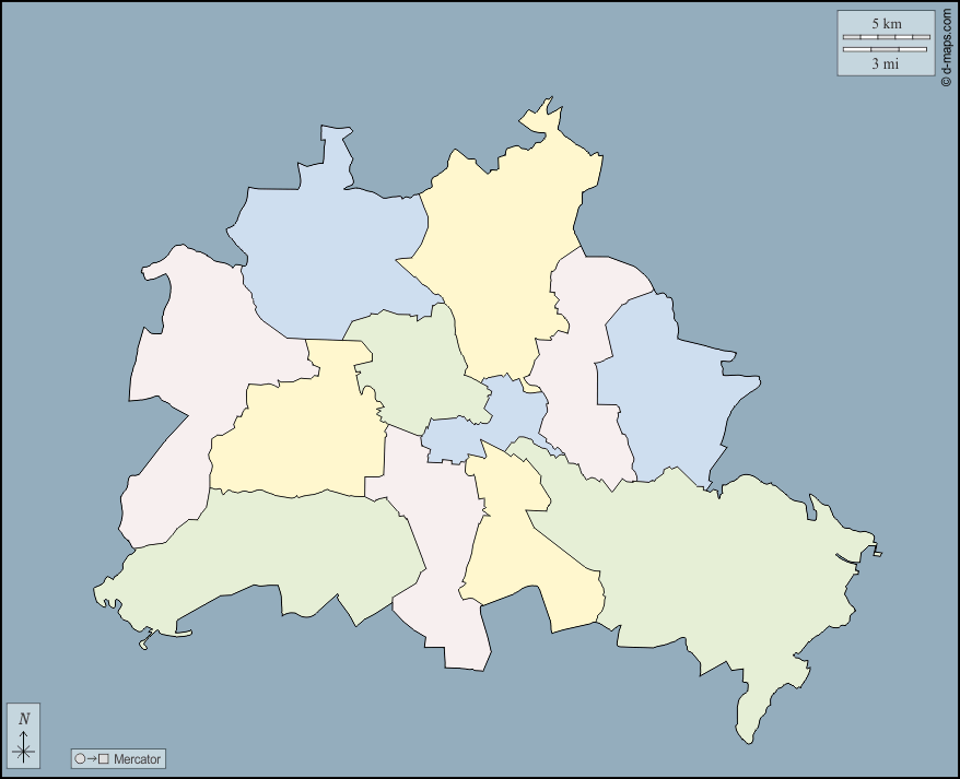 夏洛滕堡-威尔默斯多夫、弗里德里希斯海因-克罗伊茨贝格、利希滕贝格、马赞-海勒斯多夫、米特、新克尔恩、潘科、赖尼肯多夫、施潘道、施特格利茨-策伦多夫、滕珀尔霍夫-舍恩贝格、特雷普托-科佩尼克。