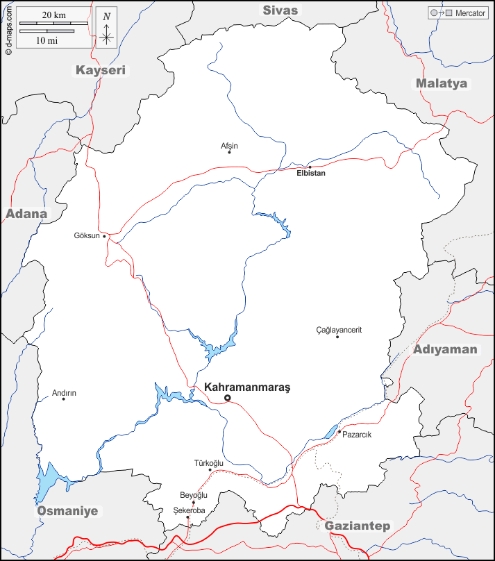 d-maps > 亚洲 > 土耳其 > 卡赫拉曼马拉什省 > 边界, 水文学, 主要城市, 道路, 名称
