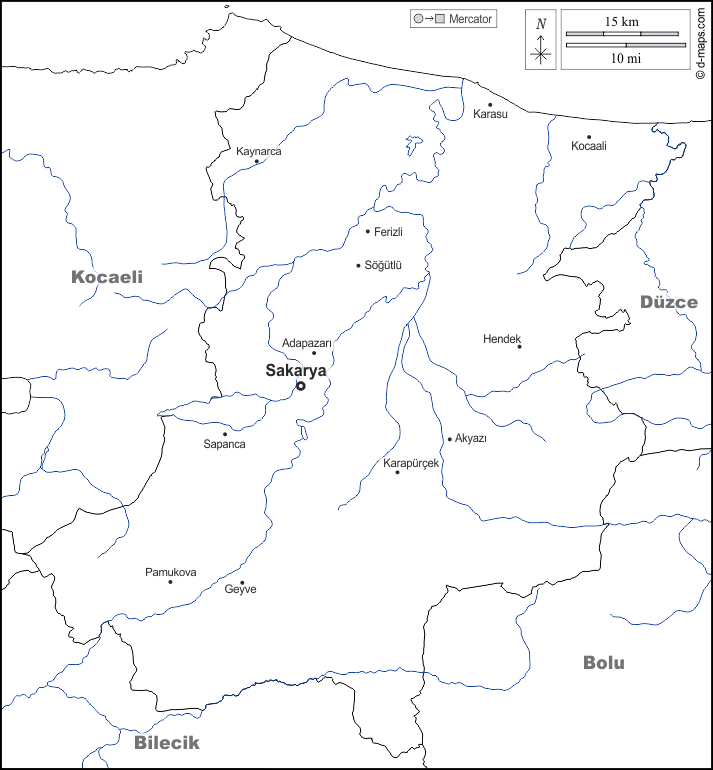 d-maps > 亚洲 > 土耳其 > 萨卡里亚省 > 边界, 水文学, 主要城市, 名称, 白