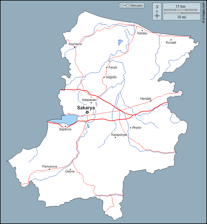 d-maps > 亚洲 > 土耳其 > 萨卡里亚省 > 大纲, 水文学, 主要城市, 道路, 名称