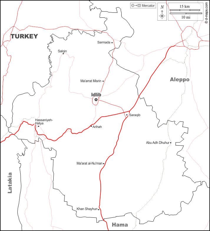 d-maps > 亚洲 > 叙利亚 > 伊德利卜省 > 边界, 主要城市, 道路, 名称, 白
