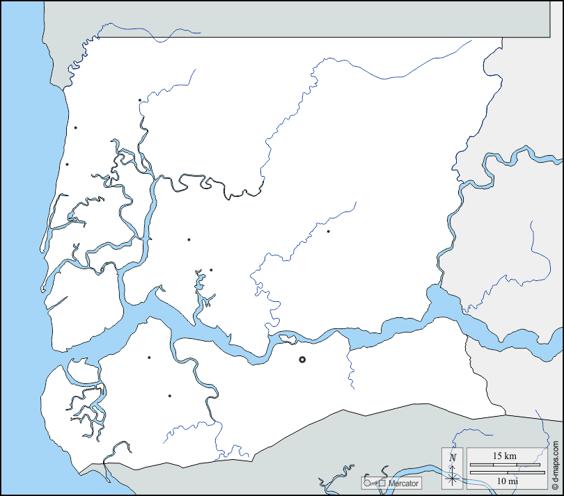d-maps > 非洲 > 塞内加尔 > 济金绍尔区 > 边界, 水文学, 主要城市