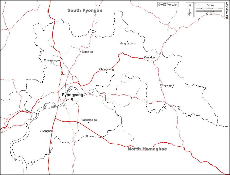 d-maps > 亚洲 > 朝鲜民主主义人民共和国 > 平壤市 > 边界, 主要城市, 道路, 名称, 白