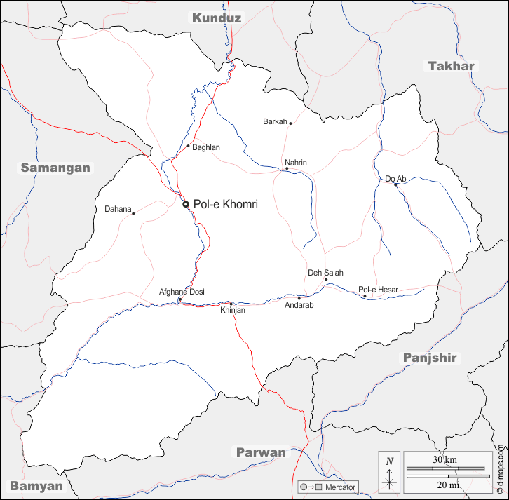 d-maps > 亚洲 > 阿富汗 > 巴格兰省 > 边界, 水文学, 主要城市, 道路, 名称