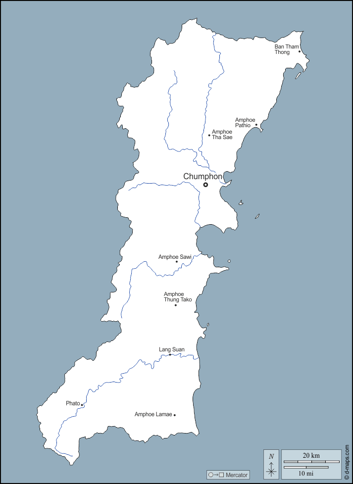 Amphoe Lamae - Amphoe Pathio - Amphoe Sawi - Amphoe Tha Sae - Amphoe Thung Tako - Ban Tham Thong - Chumphon - Lang Suan - Phato