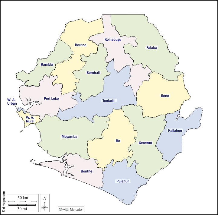 Bo - Bombali - Bonthe - Falaba - Kailahun - Kambia - Karene - Kenema - Koinadugu - Kono - Moyamba - Port Loko - Pujehun - Tonkolili - Western Area Rural - Western Area Urban