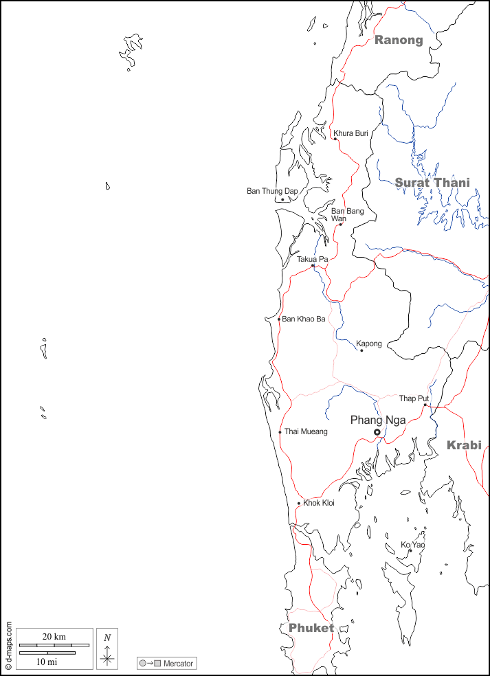 d-maps > 亚洲 > 泰国 > 攀牙府 > 边界, 水文学, 主要城市, 道路, 名称, 白