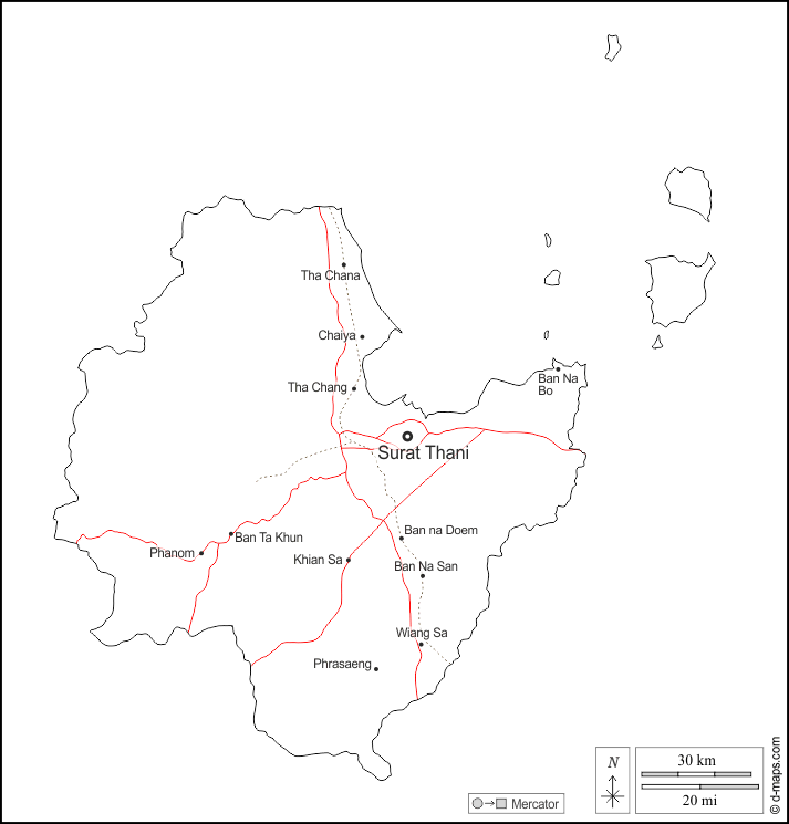 d-maps > 亚洲 > 泰国 > 素叻他尼府 > 大纲, 主要城市, 道路, 名称, 白