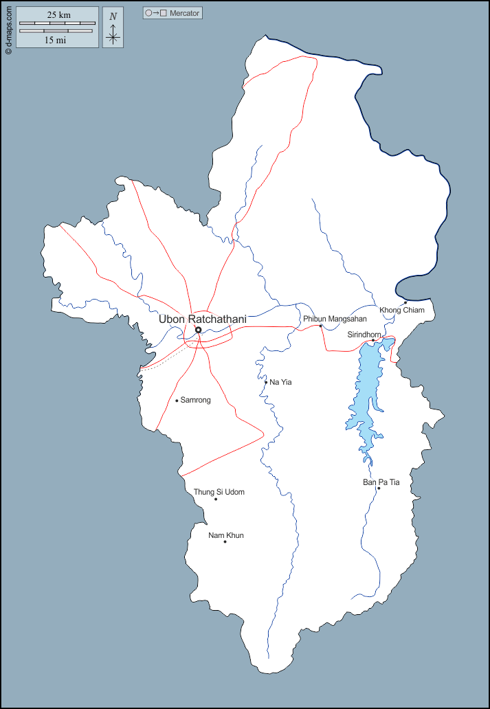 d-maps > 亚洲 > 泰国 > 烏汶府 > 大纲, 水文学, 主要城市, 道路, 名称