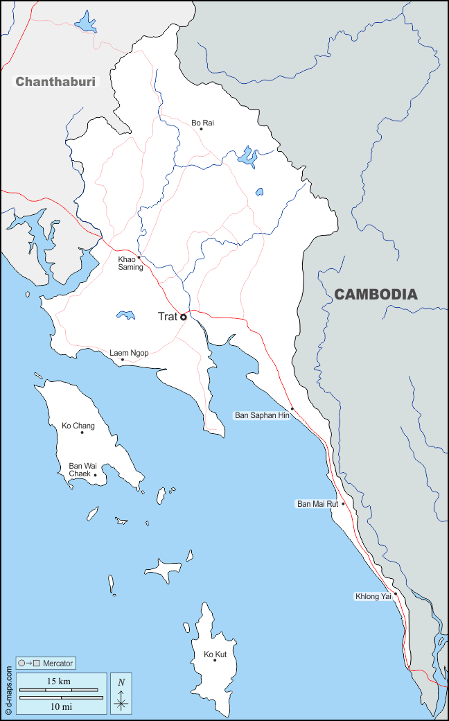 d-maps > 亚洲 > 泰国 > 達叻府 > 边界, 水文学, 主要城市, 道路, 名称