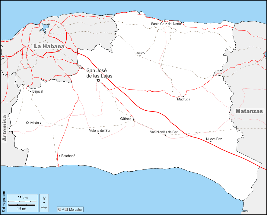 Batabanó - Bejucal - Güines - Jaruco - Madruga - Melena del Sur - Nueva Paz - Quivicán - San José de las Lajas - San Nicolás de Bari - Santa Cruz del Norte