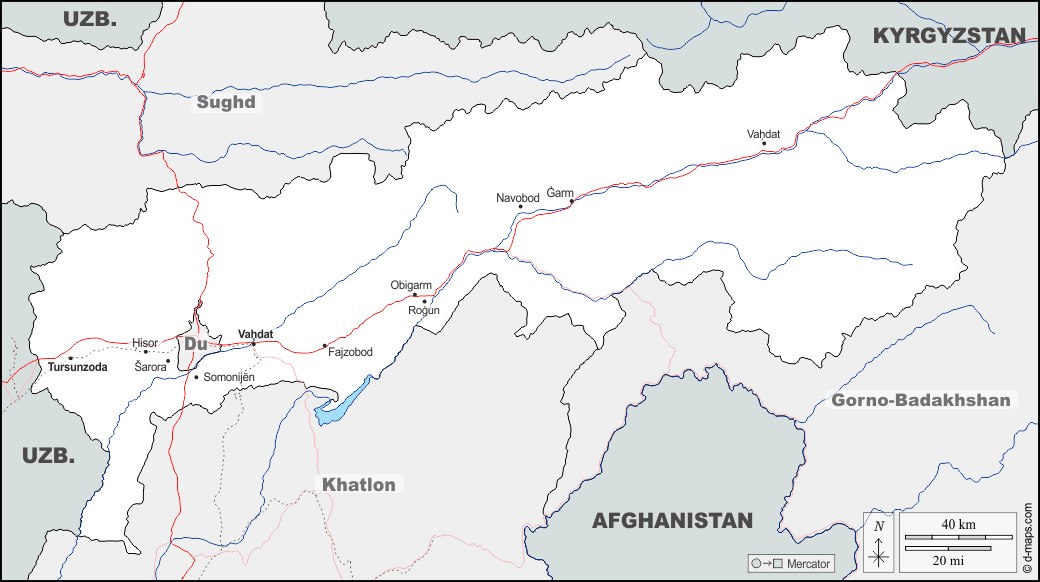 d-maps > 亚洲 > 塔吉克斯坦 > 共和國直轄區 > 边界, 水文学, 主要城市, 道路, 名称