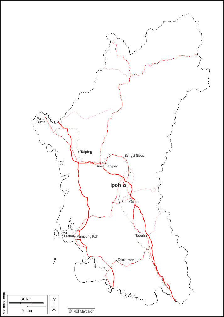 d-maps > 亚洲 > 马来西亚 > 霹靂 > 大纲, 主要城市, 道路, 名称, 白
