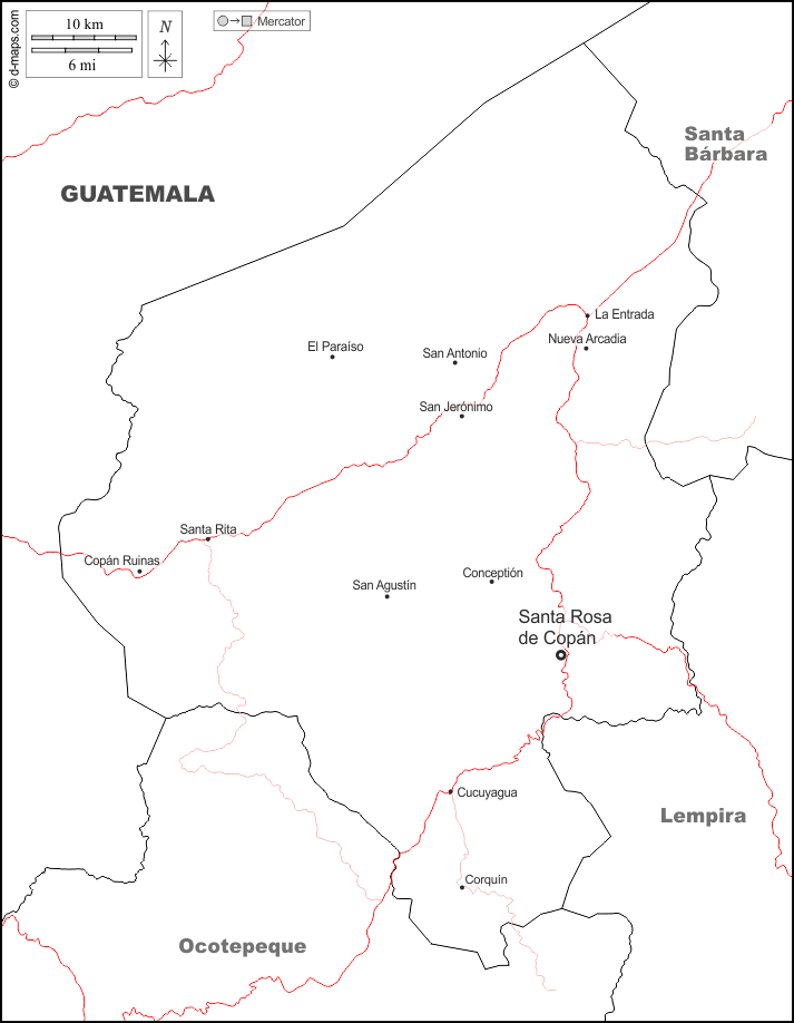 d-maps > 美洲 > 洪都拉斯 > 科潘省 > 边界, 主要城市, 道路, 名称, 白