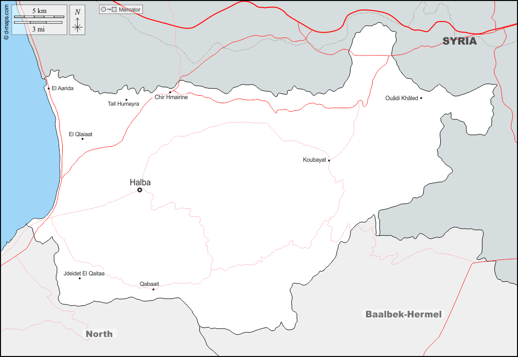 d-maps > 亚洲 > 黎巴嫩 > 阿卡尔省 > 边界, 主要城市, 道路, 名称