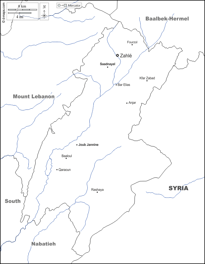 d-maps > 亚洲 > 黎巴嫩 > 貝卡省 > 边界, 水文学, 主要城市, 名称, 白