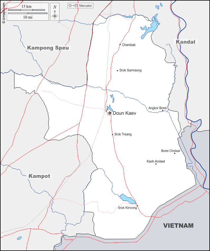 d-maps > 亚洲 > 柬埔寨 > 茶胶省 > 边界, 水文学, 主要城市, 道路, 名称
