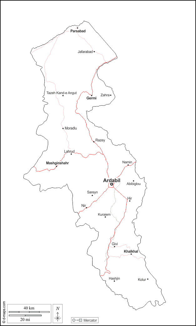 d-maps > 亚洲 > 伊朗 > 阿爾達比勒省 > 大纲, 主要城市, 道路, 名称, 白