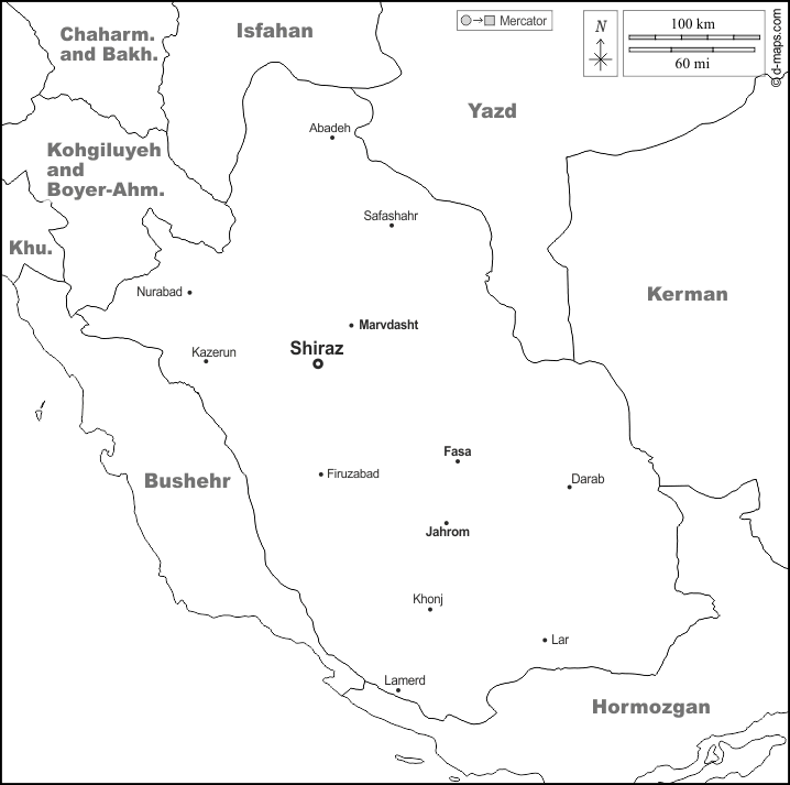 d-maps > 亚洲 > 伊朗 > 法爾斯省 > 边界, 主要城市, 名称, 白