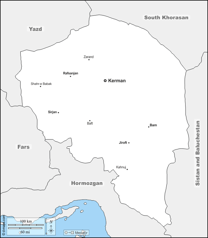 Baft - Bam - Jiroft - Kahnuj - Kerman - Rafsanjan - Shahr-e Babak - Sirjan - Zarand