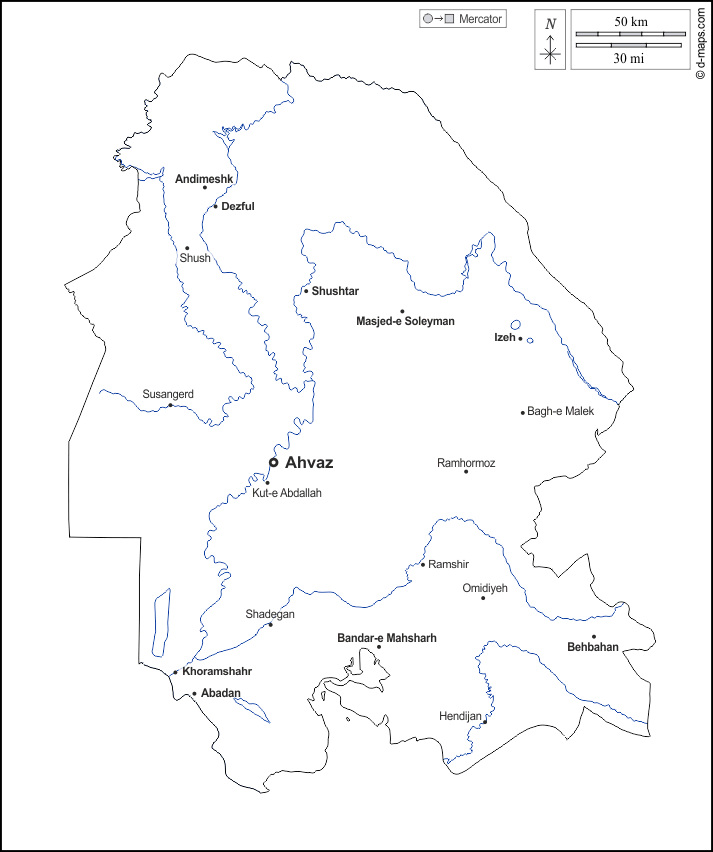 d-maps > 亚洲 > 伊朗 > 胡齊斯坦省 > 大纲, 水文学, 主要城市, 名称, 白