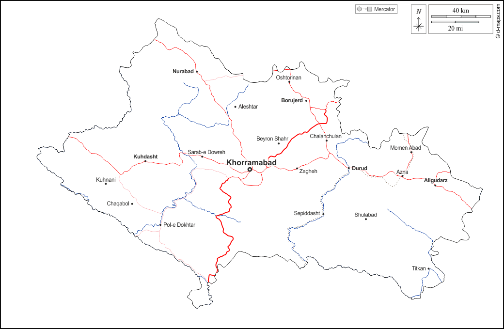 d-maps > 亚洲 > 伊朗 > 洛雷斯坦省 > 大纲, 水文学, 主要城市, 道路, 名称, 白