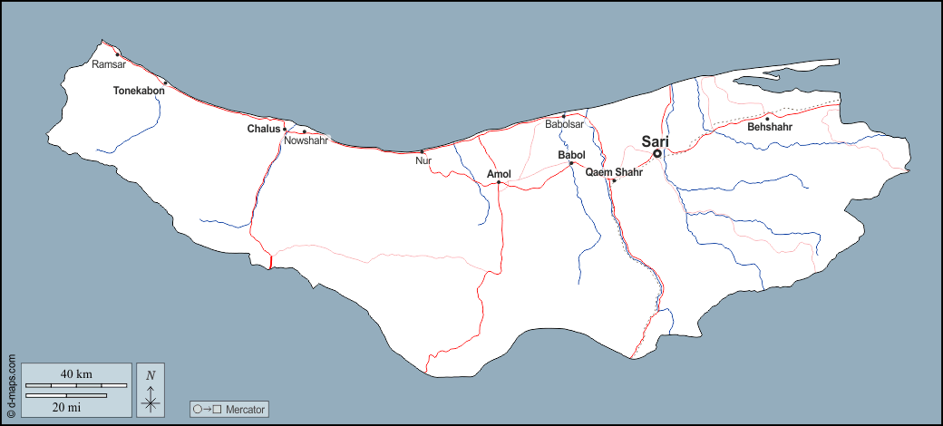 d-maps > 亚洲 > 伊朗 > 馬贊德蘭省 > 大纲, 水文学, 主要城市, 道路, 名称