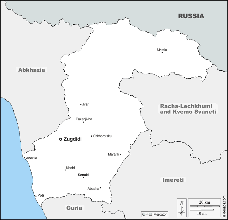 Abasha - Anaklia - Chkhorotsku - Jvari - Khobi - Martvili - Mestia - Poti - Senaki - Tsalenjikha - Zugdidi