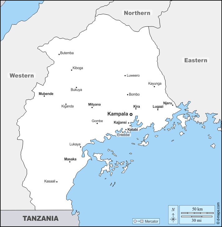 d-maps > 非洲 > 乌干达 > 中部區 > 边界, 主要城市, 名称