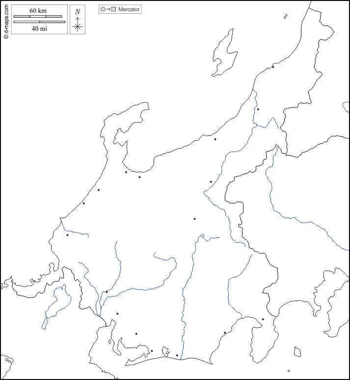 d-maps > 亚洲 > 日本 > 中部地方 > 边界, 水文学, 主要城市, 白
