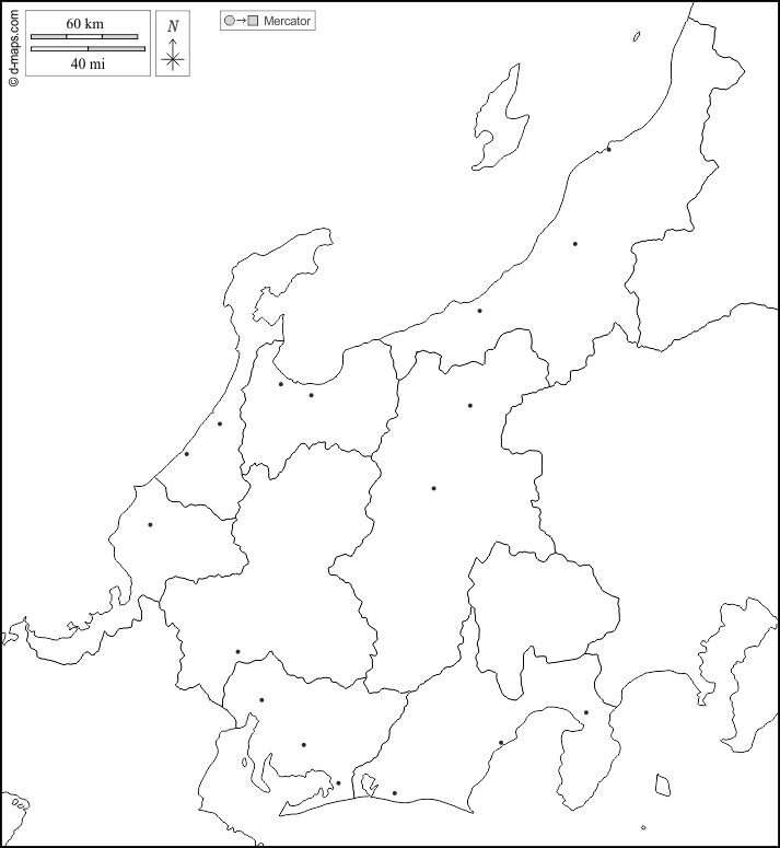 d-maps > 亚洲 > 日本 > 中部地方 > 边界, 地区, 主要城市, 白