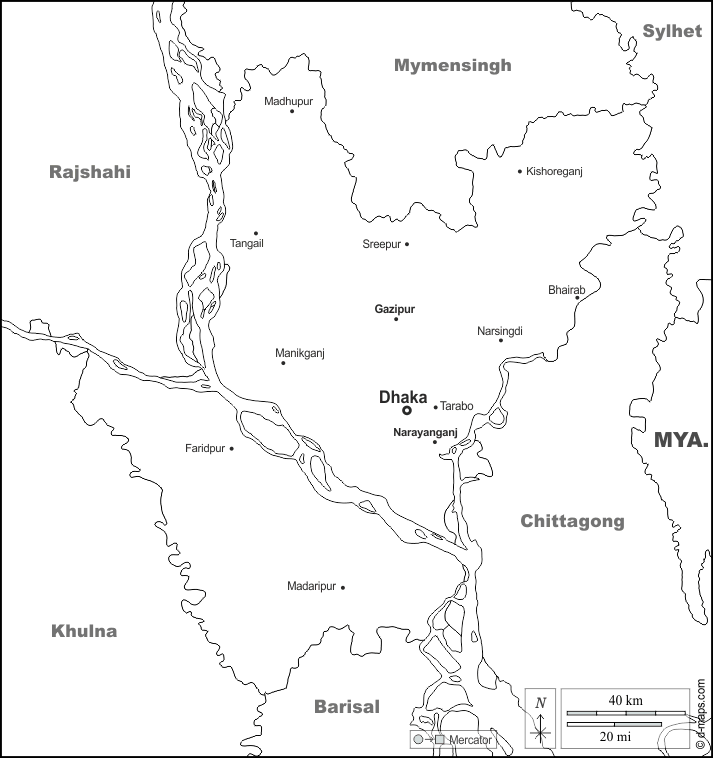 d-maps > 亚洲 > 孟加拉国 > 達卡專區 > 边界, 主要城市, 名称, 白
