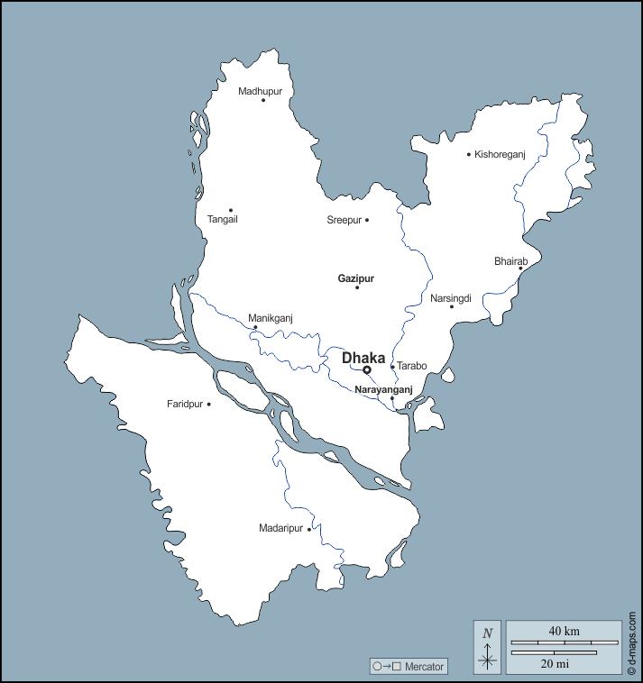 d-maps > 亚洲 > 孟加拉国 > 達卡專區 > 大纲, 水文学, 主要城市, 名称