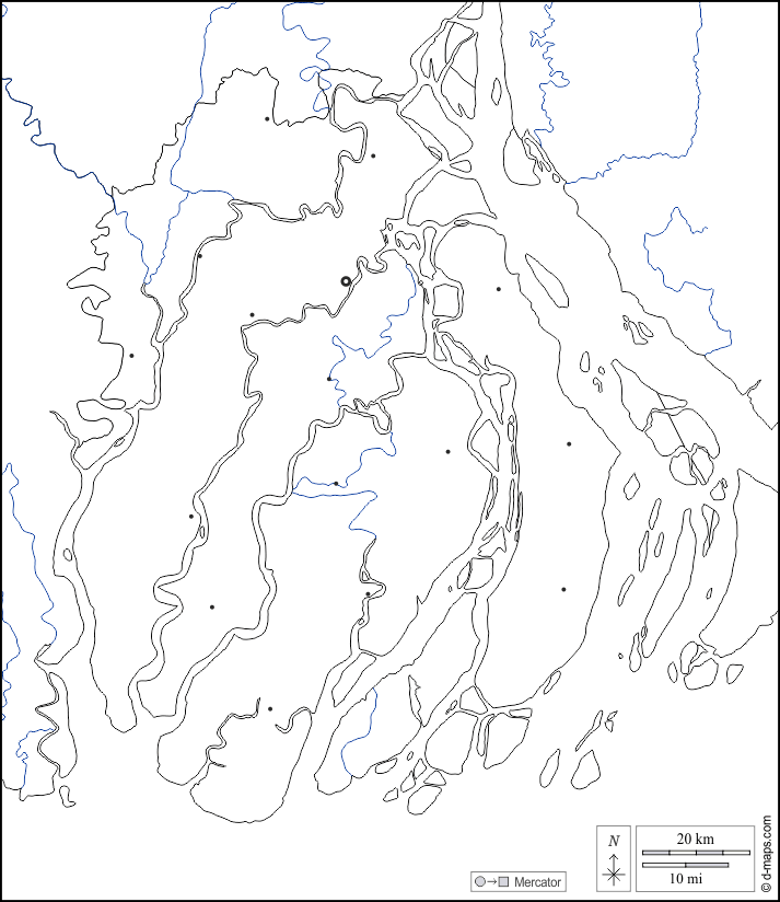 d-maps > 亚洲 > 孟加拉国 > 巴里薩爾專區 > 边界, 水文学, 主要城市, 白