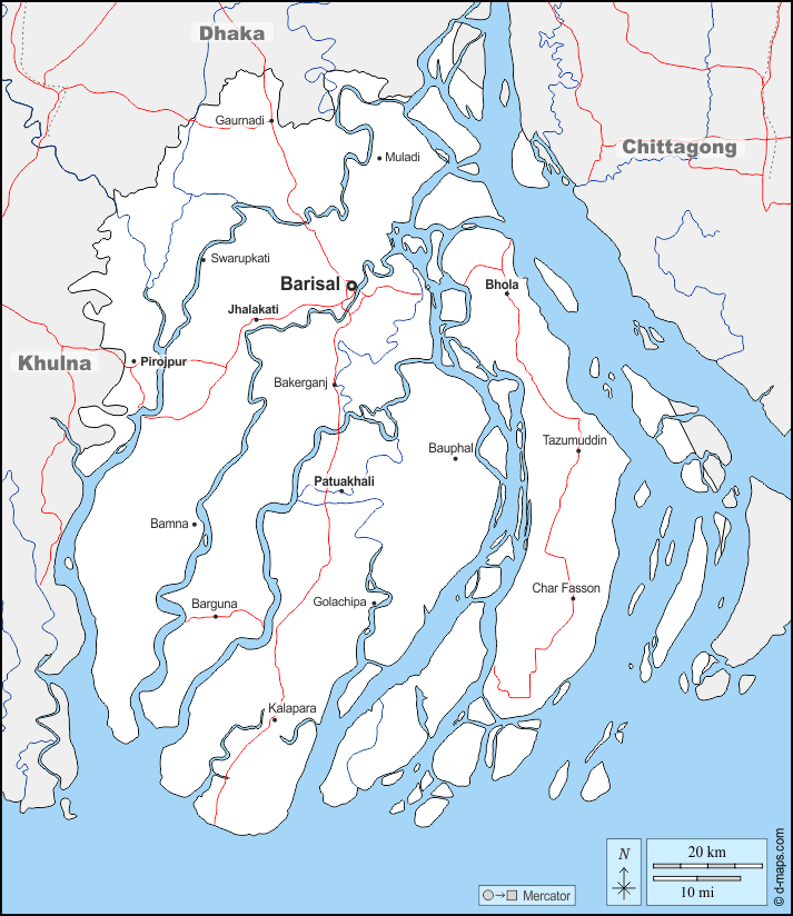 d-maps > 亚洲 > 孟加拉国 > 巴里薩爾專區 > 边界, 水文学, 主要城市, 道路, 名称