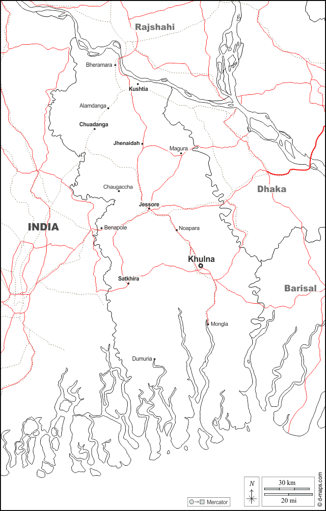 d-maps > 亚洲 > 孟加拉国 > 庫爾納專區 > 边界, 主要城市, 道路, 名称, 白