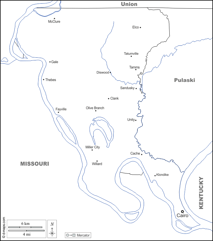 Cache - Cairo - Clank - Diswood - Elco - Fayville - Gale - Klondike - McClure - Miller City - Olive Branch - Sandusky - Tamms - Tatumville - Thebes - Unity - Willard