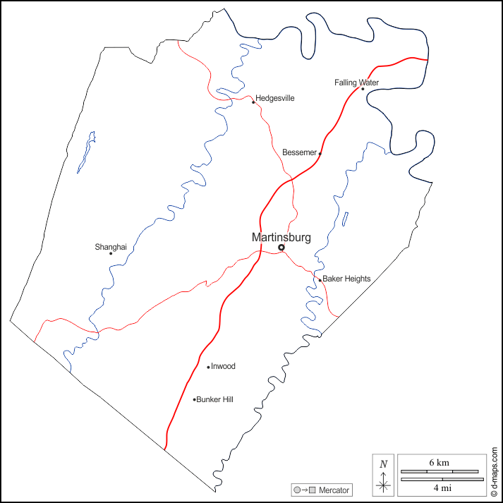 Baker Heights, Bessemer, Bunker Hill, Falling Water, Hedgesville, Inwood, Martinsburg, Shanghai.