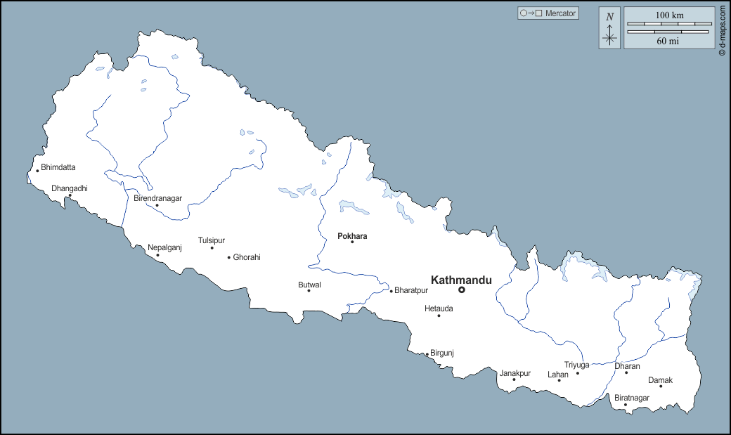 d-maps > 亚洲 > 尼泊尔 > 大纲, 水文学, 主要城市, 名称