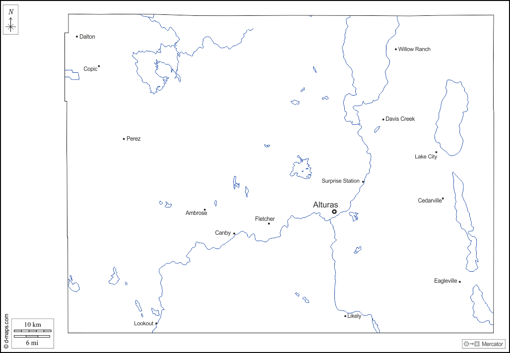 Alturas, Ambrose, Canby, Cedarville, Copic, Dalton, Davis Creek, Eagleville, Fletcher, Lake City, Likely, Lookout, Perez, Surprise Station, Willow Ranch.