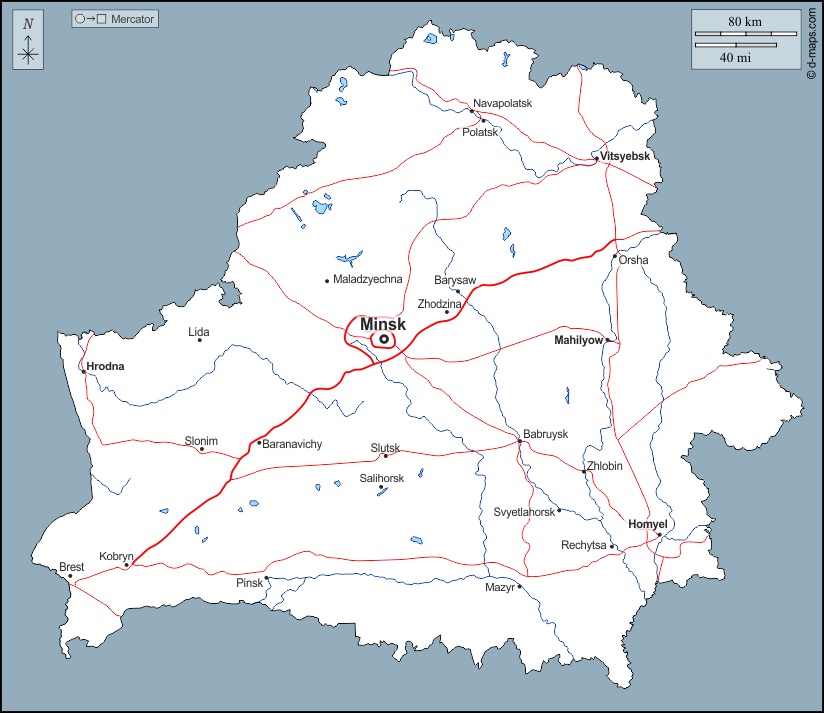 d-maps > 欧洲 > 白俄罗斯 > 白俄罗斯 > 大纲, 水文学, 主要城市, 道路, 名称