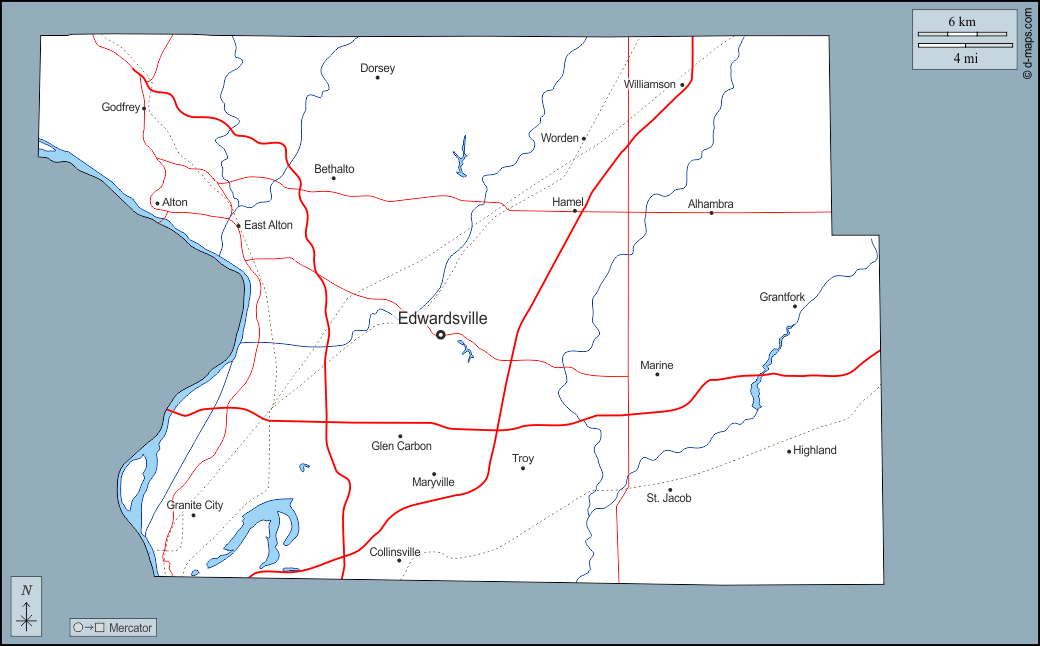 Alhambra - Alton - Bethalto - Collinsville - Dorsey - East Alton - Edwardsville - Glen Carbon - Godfrey - Granite City - Grantfork - Hamel - Highland - Marine - Maryville - St. Jacob - Troy - Williamson - Worden