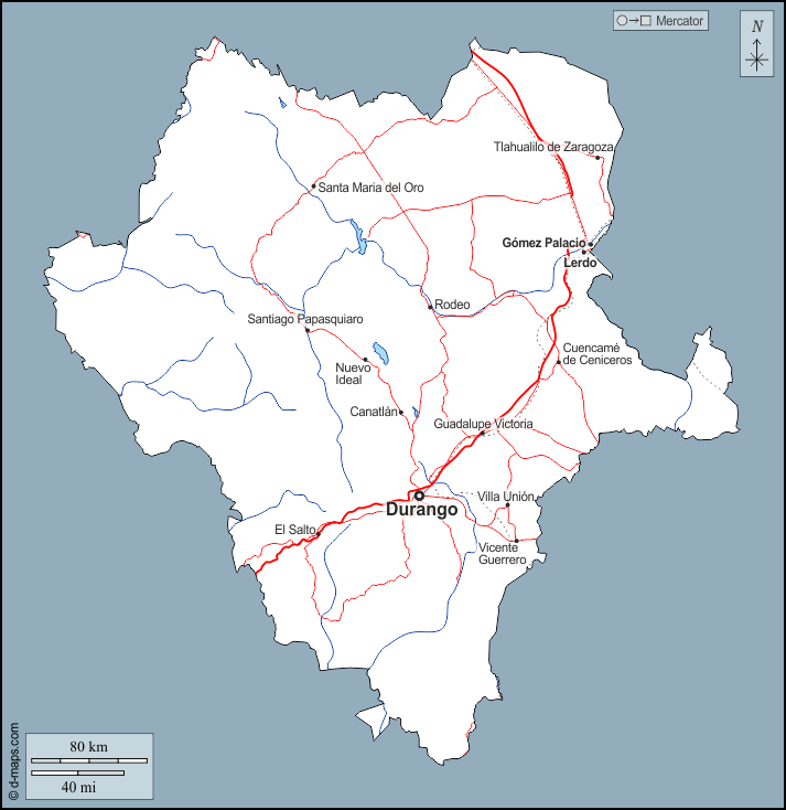 d-maps > 美洲 > 墨西哥 > 杜蘭戈州 > 大纲, 水文学, 主要城市, 道路, 名称