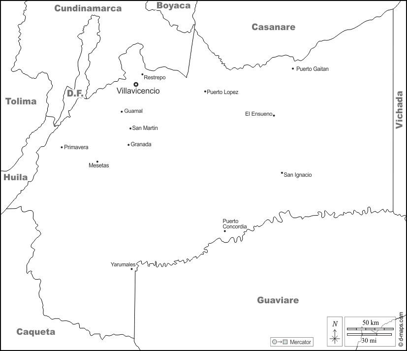 d-maps > 美洲 > 哥伦比亚 > 元部门 > 边界, 主要城市, 名称, 白