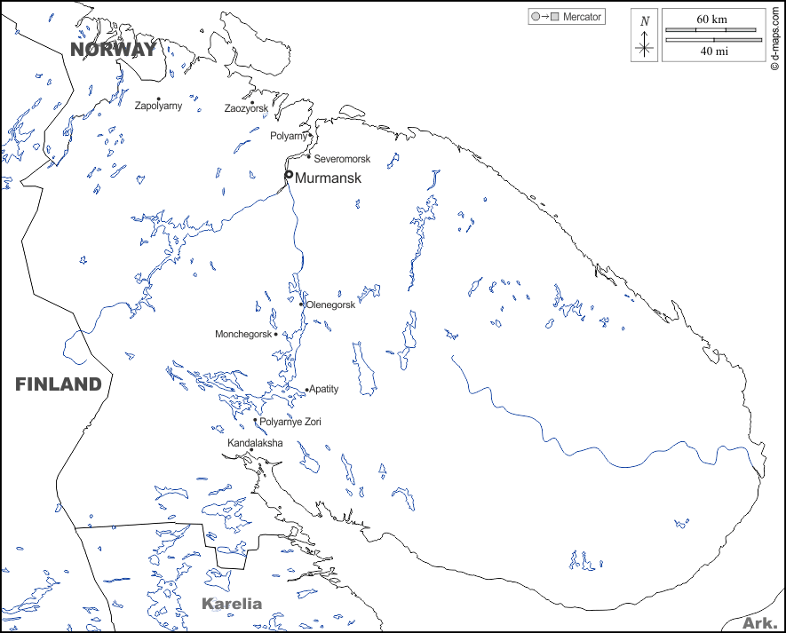 d-maps > 欧洲 > 俄罗斯 > 摩爾曼斯克州 > 边界, 水文学, 主要城市, 名称, 白
