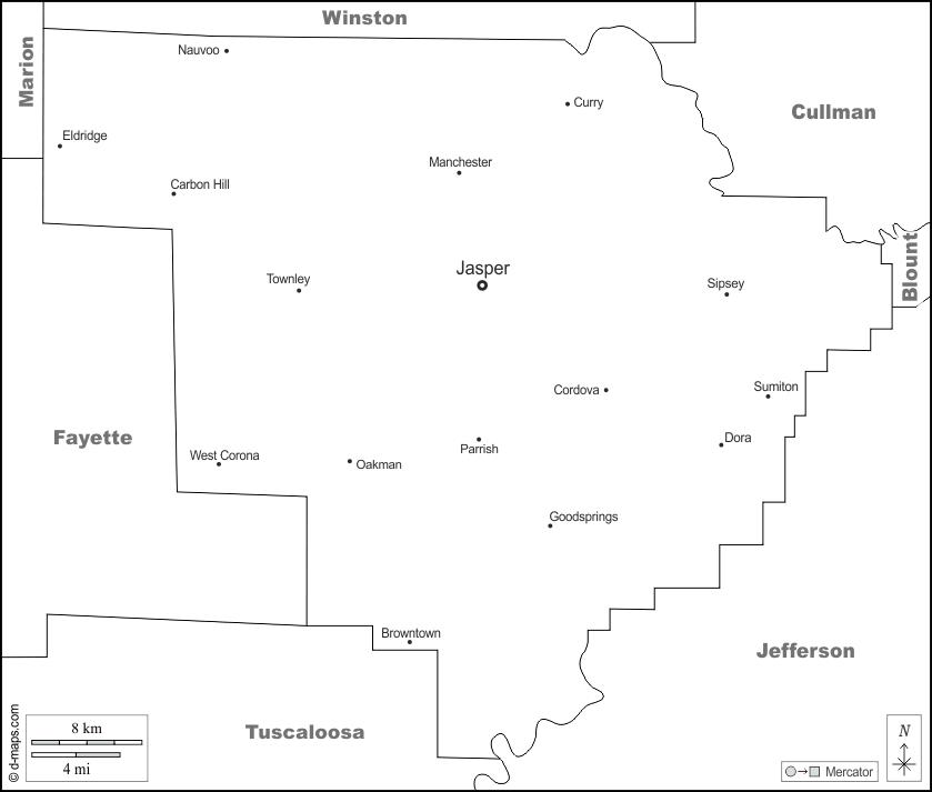 Browntown - Carbon Hill - Cordova - Curry - Dora - Eldridge - Goodsprings - Jasper - Manchester - Nauvoo - Oakman - Parrish - Sipsey - Sumiton - Townley - West Corona
