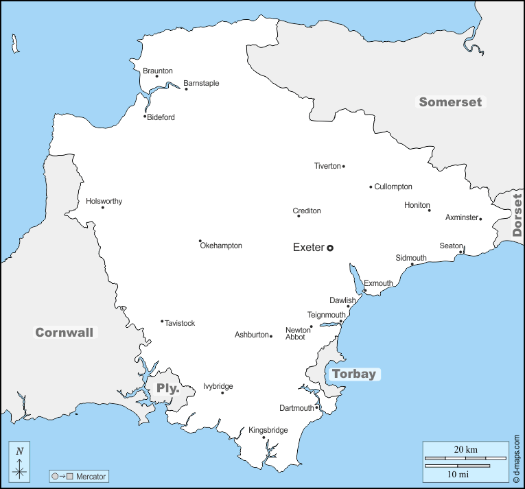 d-maps > 欧洲 > 英国 > 德文 > 边界, 主要城市, 名称